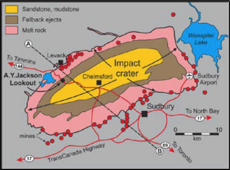 Syngenetic deposits are economic deposits that originate during the impact event, or immediately afterward, as a direct result of impact processes. The deposits occur as a product of shock metamorphism, melting, and post-impact hydrothermal activity resulting in economic deposits of copper, nickel, diamonds, zinc, lead uranium, platinum, gold, and uranium. Impact diamonds have been observed at the Popigai crater, the world’s largest known diamond deposit, as a product of the shock metamorphism caused graphite to transition to diamond and crystallize from coal. The ore deposits of Sudbury structure in Canada, one of world largest suppliers of nickel and copper ores, are closely associated with the impact melt sheet, dykes, and hydrothermal system caused by the impact event.