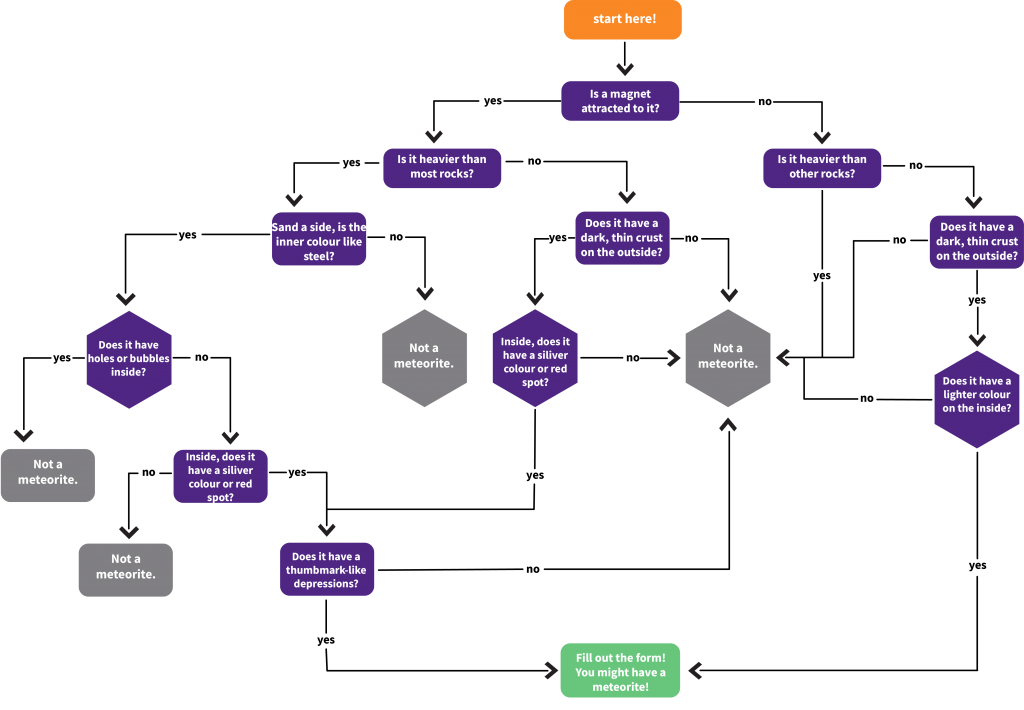 Numerous people come across funny-looking rocks that they believe to be meteorites that turn out to be “meteor-wrongs”. Below you will find a flowchart and information to help you determine if you have a potential meteorite. If your rock passes the test below and you would like our help to identify it please fill out the form found here.