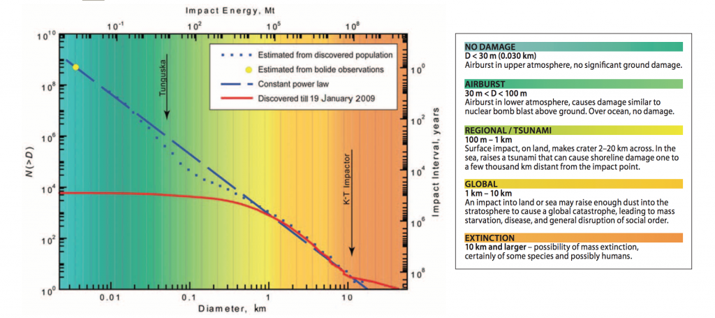 The devastating consequences of impact events arose in the 1980s when the mass extinction event associated with the end of the dinosaurs was linked to the Chicxulub impact event. Understanding the frequency and environmental effects of impact events became essential in assessing the impact hazard. Fortunately for life on Earth, as seen in the image below, the occurrence of large size impactors that can cause large-scale extinction events are rare, on the order of hundreds of millions of years.